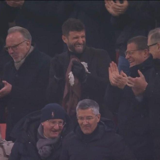 拜仁对阵美因茨的比赛中,场边镜头显示,穆勒与拜仁体育总监埃贝尔在看台上目睹小将伦纳特-卡尔为拜仁首开记录后,两人顿时喜笑颜开。