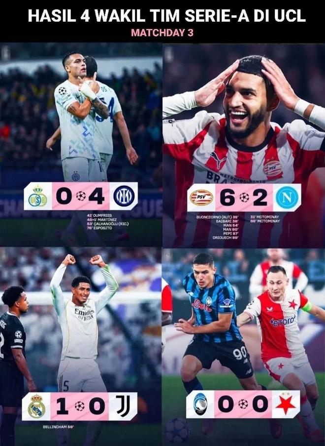 尤文客场0:1小负皇马已经算是不错的结果,可那不勒斯2:6惨败荷甲埃因霍温,亚特兰大主场0:0被捷克球队布拉格斯拉维亚逼平实在是令人难以接受!征战欧联杯的罗马同样爆冷,主场1:2不敌弱旅比尔森胜利,巧合的是这支球队同样来自捷克联赛。两支意甲球队主场面对两支捷甲弱旅却打出了一平一负的战绩,匪夷所思!